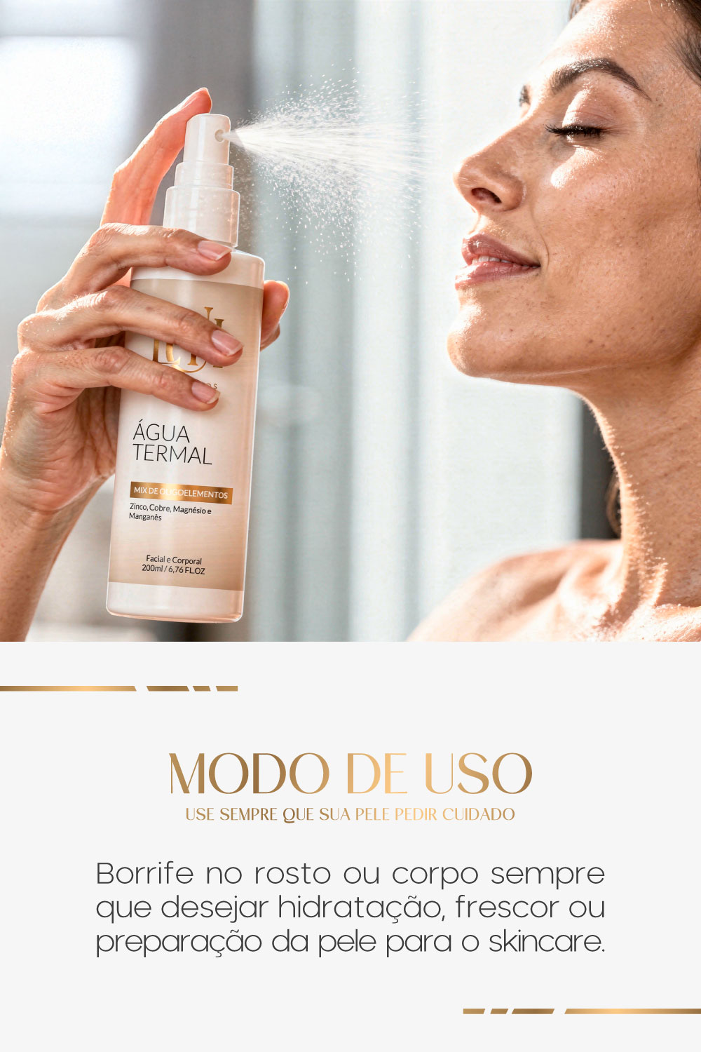 Enriquecida com oligoelementos como Zinco, Cobre, Magnésio e Manganês, ela proporciona hidratação imediata, efeito calmante e revitalização da pele.