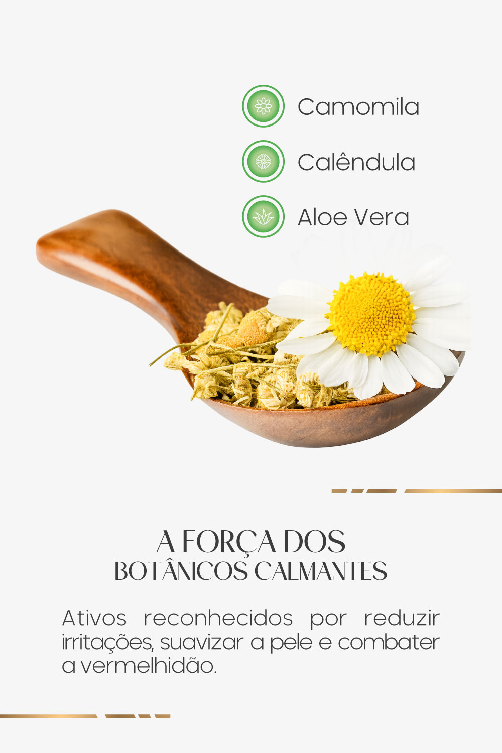 Sua fórmula é enriquecida com Camomila, Calêndula e Aloe Vera, ativos reconhecidos pelas propriedades calmantes, anti-inflamatórias e regeneradoras.